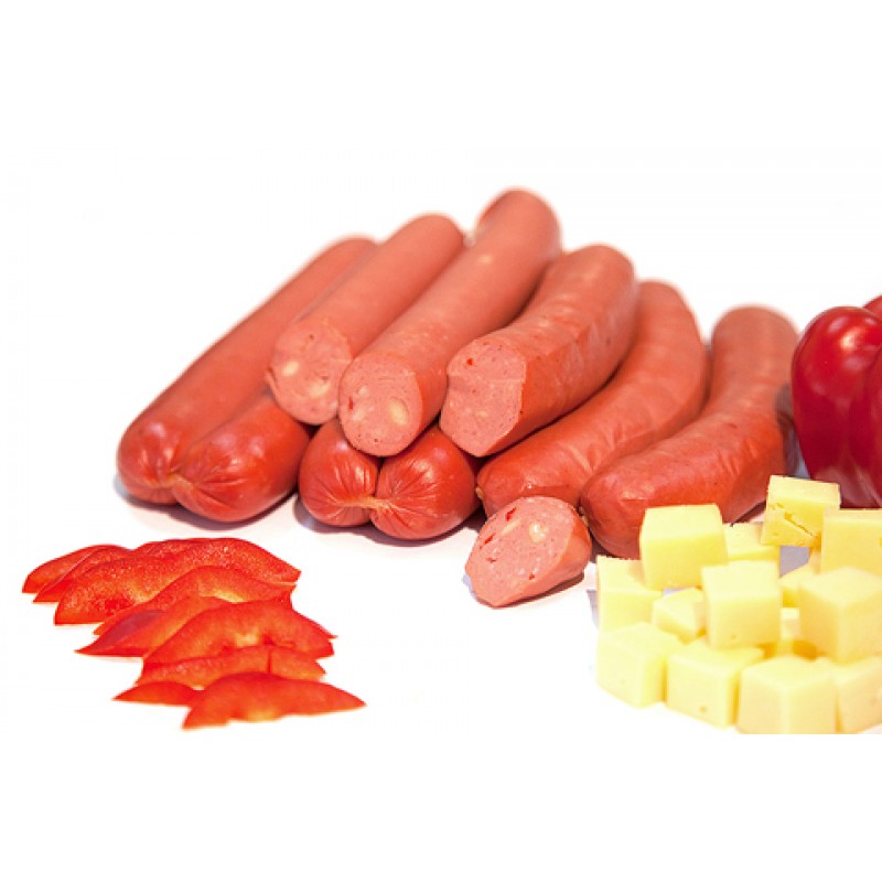 Η σύνθεση περιλαμβάνει χοιρινό κρέας, τυρί Gouda, κόκκινη πιπεριά, μπαχαρικά και βρώσιμο έντερο για φυσική εμφάνιση και γεύση.